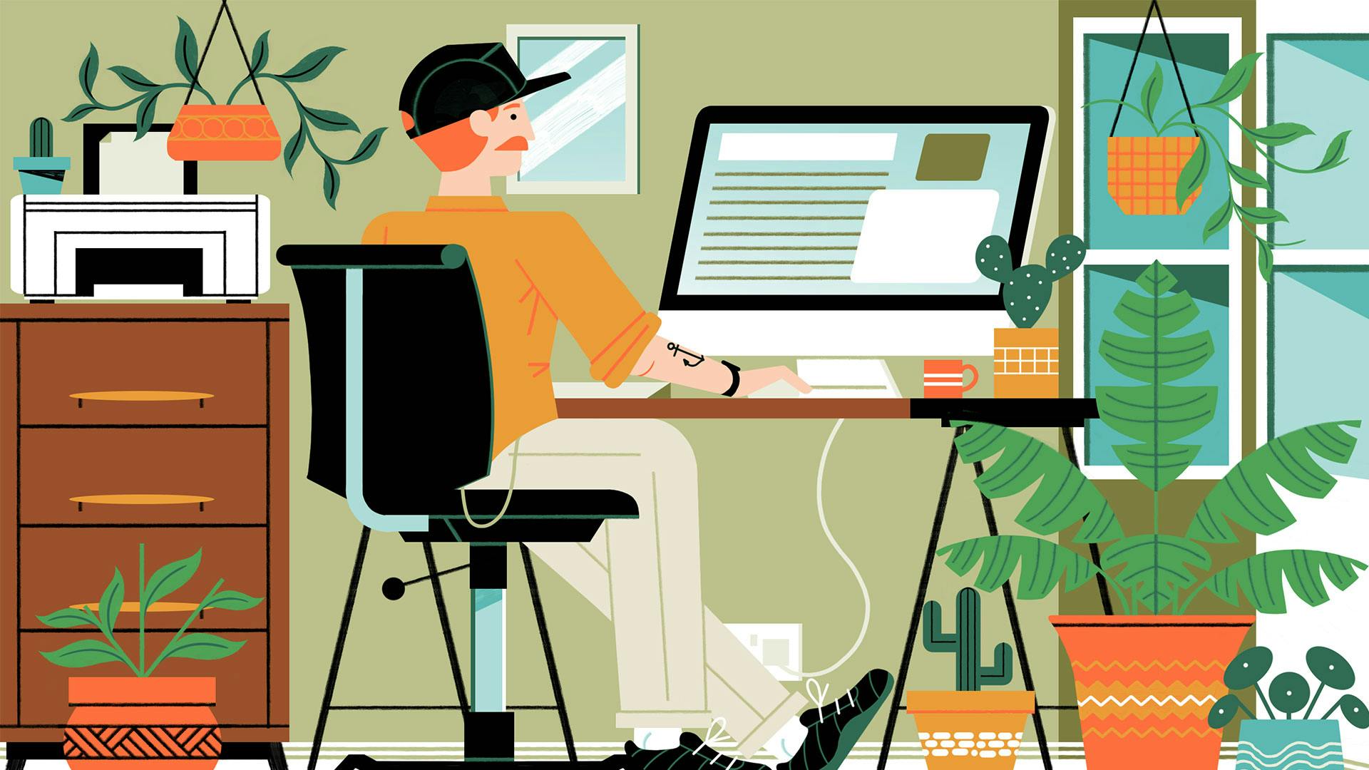 Guardian home office illustration by Michael Driver A vibrant home office illustration for The Guardian, featuring a modern workspace design by... | Image | - | |